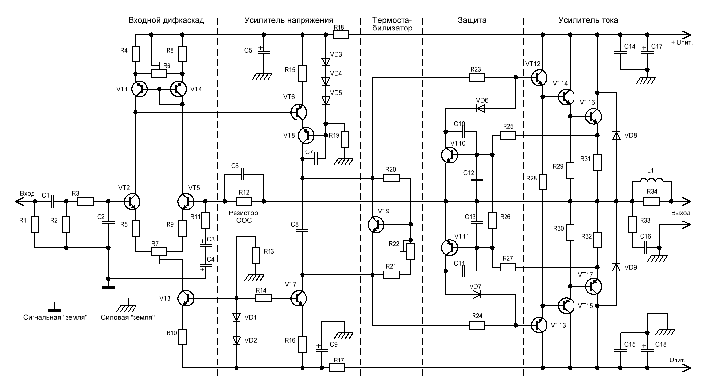 Рассмотрим данный алгоритм на примере ремонта гипотетического транзисторного УМЗЧ с биполярными транзисторами в выходных каскадах (рис.1), не слишком примитивного, но и не очень сложного. Такая схема является наиболее распространенной «классикой жанра». Функционально он состоит из следующих блоков и узлов:
