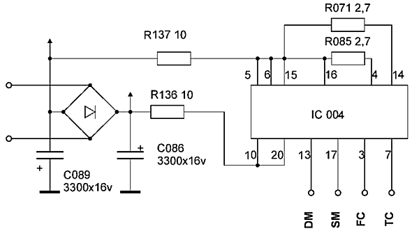 Фрагмент принципиальной схемы приведен на рис.1. Питание IC004 осуществляется от нестабилизированного источника (порядка +12 В) через гасящие резисторы R136, R137. Токи потребления этой ИС приведены в таблице. Анализ напряжений в контрольных точках осциллографом показал, что даже в самых тяжелых режимах это напряжение не превышает +4В, а в обычных еще меньше.