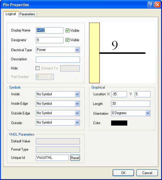 Открывается окно атрибутов, и мы меняем необходимые атрибуты и номер вывода (Designator). Следующие будут меняться относительно, только что введенного. (Выводы, так же наследуют и название, что хорошо видно на рисунке 14. Название вывода +VCC, это артефакт оставшийся от предыдущего символа.) Открыть окно атрибутов, так же, можно просто двойным кликом на выводе. После установки всех выводов, символ практически готов (рис.16). Не забываем сохраниться.