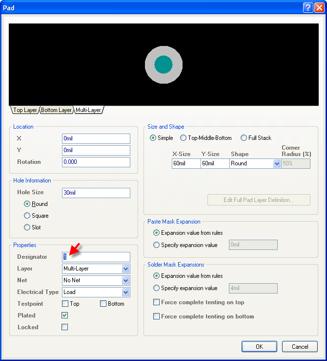 - Plated – наличие металлизации (параметр важный, в AD начиная с 6-го, можно создать два файла сверловки, для отверстий с металлизацией и для крепежных отверстий, без металлизации)