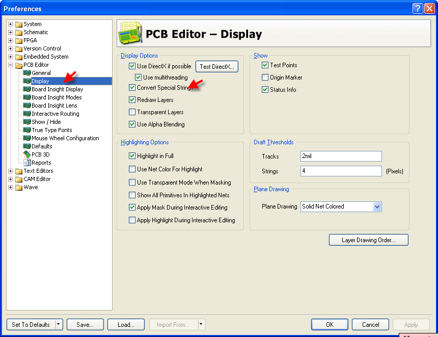 Меняем текст строки на .Designator (рис.33, 34). Обратите внимание на точку перед текстом – это признак служебной строки. Осталось включить отображение данных вместо служебных строк, Главное меню|ToolsPreference, далее PCB EditorDisplayConvert Special Strings (Рис. 35).
