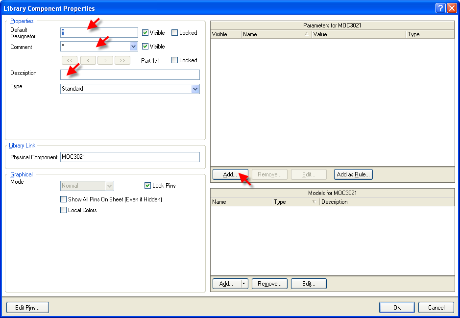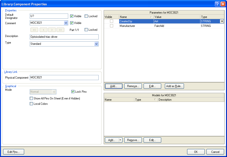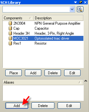 Теперь добавим несколько названий аналогов (Aliases). Этот параметр используется при поиске компонента в библиотеке по названию. После добавления аналогов, они будут видны в окне выбора компонентов, как отдельные компоненты. Жмем кнопку Add… (рис.9) и вписываем имя (в моем случае это MOC3022 и MOC3023).