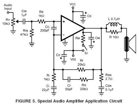 | 6 | Cc* | Компенсационный конденсатор. Так же фильтрует входящий сигнал от высокочастотных помех. Ну, там скажем от люминесцентных ламп, прочих ВЧ преобразователей, а так же от ВЧ помех от включения холодильников, сварочных трансформаторов, сотовых телефонов и прочей бытовой техники. Все это обрезание сделано для того, чтобы защитить микросхему, и ее выходные каскады от « quasi-saturation oscillations» - если быть проще, то от самовозбуждения, выгорания или звона. Тоже не совсем обязательный элемент. Кроме того, к применению этого элемента стоит прибегать крайне осторожно, так как и он и Cf обладают малым внутренним сопротивлением на высоких частотах и неправильный выбор номинала может сильно обрезать ВЧ (будет ВЧ как в Веге 101). Но если усилитель «ловит» радио – то наличие этого конденсатора необходимо. |