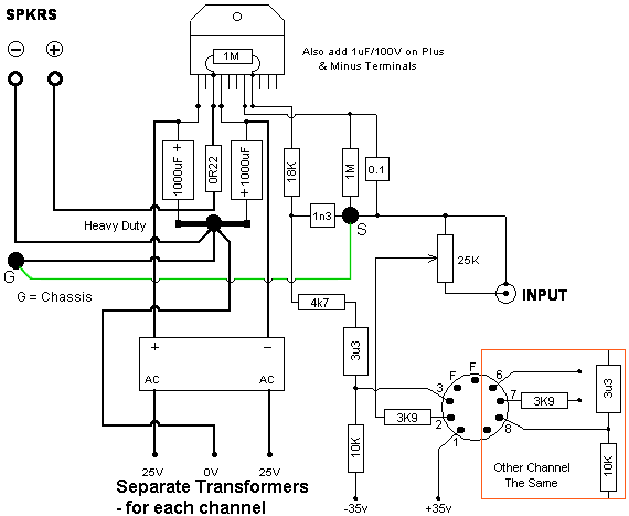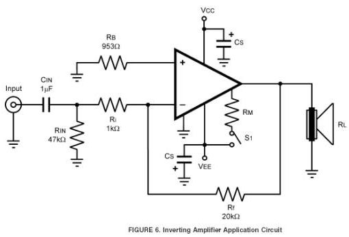 | 8 | Cs | Ну это просто конденсатор фильтра питания (но вот его номинал, тип и расположение на печатке и расположение дорожек на плате не так просто). В общих чертах, требования к установке этих конденсаторов очень просты - как можно ближе к выводам микросхемы, кроме того, желательно зашунтировать эти конденсаторы высокочастотными, что особенно полезно при эксплуатации усилителя на повышенных мощностях. Если основные конденсаторы блока питания соединены с микросхемой проводами, то имеет смысл дополнительно, непосредственно у выводов микросхем поставить электролитические конденсаторы емкостью не менее 1000 микрофарад и зашунтировать их высокочастотными керамическими или пленочными. |